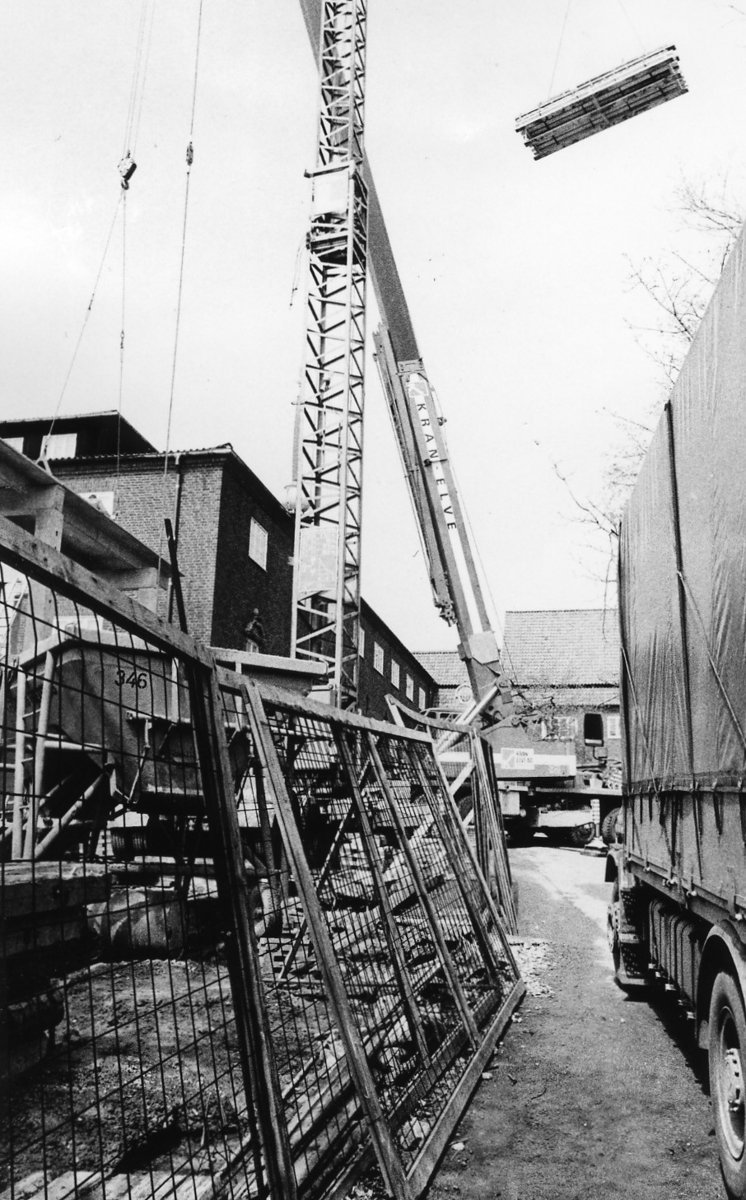 'Tillbyggnaden av Göteborgs Naturhistoriska Museum juni 1979. Östra ytterväggen Göteborgs Naturhistoriska Museum, lastbil och lyftkran i arbete. :: :: Ingår i serie med fotonr. 5527:69-216.'