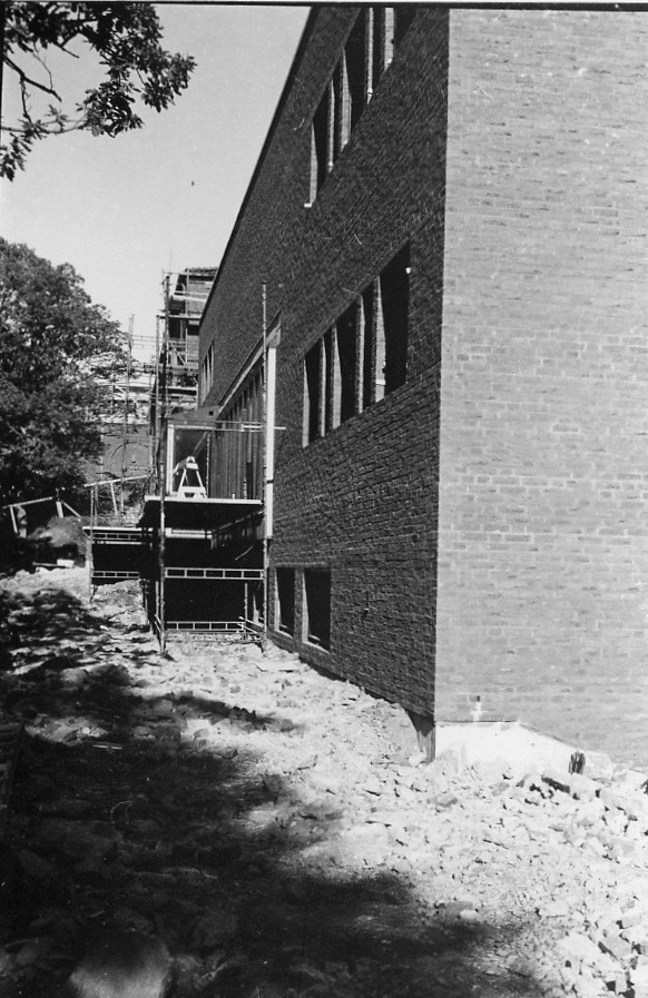 'Tillbyggnaden 1 oktober 1979. Västra ytterväggen Göteborgs Naturhistoriska Museum och tillbyggnaden. Byggnadsställningar. :: :: Ingår i serie med fotonr. 5527:69-216.'
