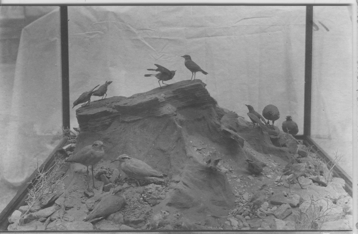'Div. bilder på ''museala arrangemang av fåglar'', bilderna är insamlade av Leonard Axel Jägerskiöld. :: :: Diverse olika monterade djur på sten, bl.a. fåglar, ormar och gnagare. Enligt skylt på annan bild: ''Adaptation of external colouring to the conditions of life'''