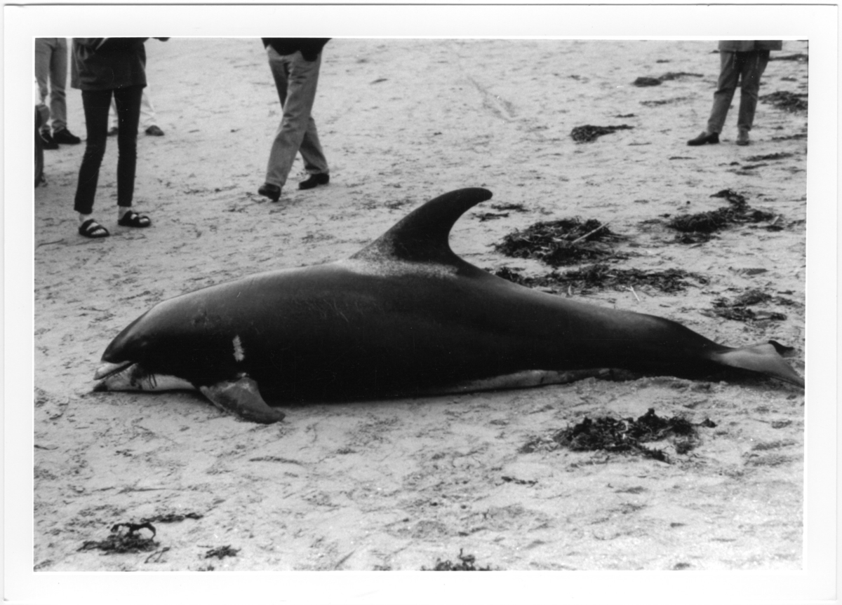 'Strandad vitnosdelfin på stranden. Kroppen vägde ca 140 kg och var 261 cm lång. Se även fotonr. 6765:19. :: :: Ingår i serie med fotonr. 6765:1-39.'
