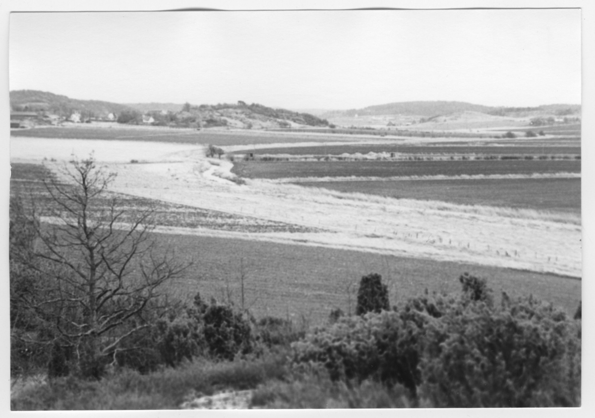 'Bildtext: ''Sedimentyta. Kvillen. Riktning 139.'' I förgrunden enbuskar och lövträd. Vy ut över öppna fält, åkrar. Slingrande väg. På avstånd hus. :: :: Ingår i serie med fotonr. 6970:1-1125, dokumentation av Hisingens naturgeografi, visande landskapsformerna i stora drag och gjord inför exploateringen av området. Platserna för fotograferingen finns utsatta på karta i skala 1:4000 som finns på Göteborgs Naturhistoriska musem. Fotoriktningen mättes med kompass i gammalgrader.'