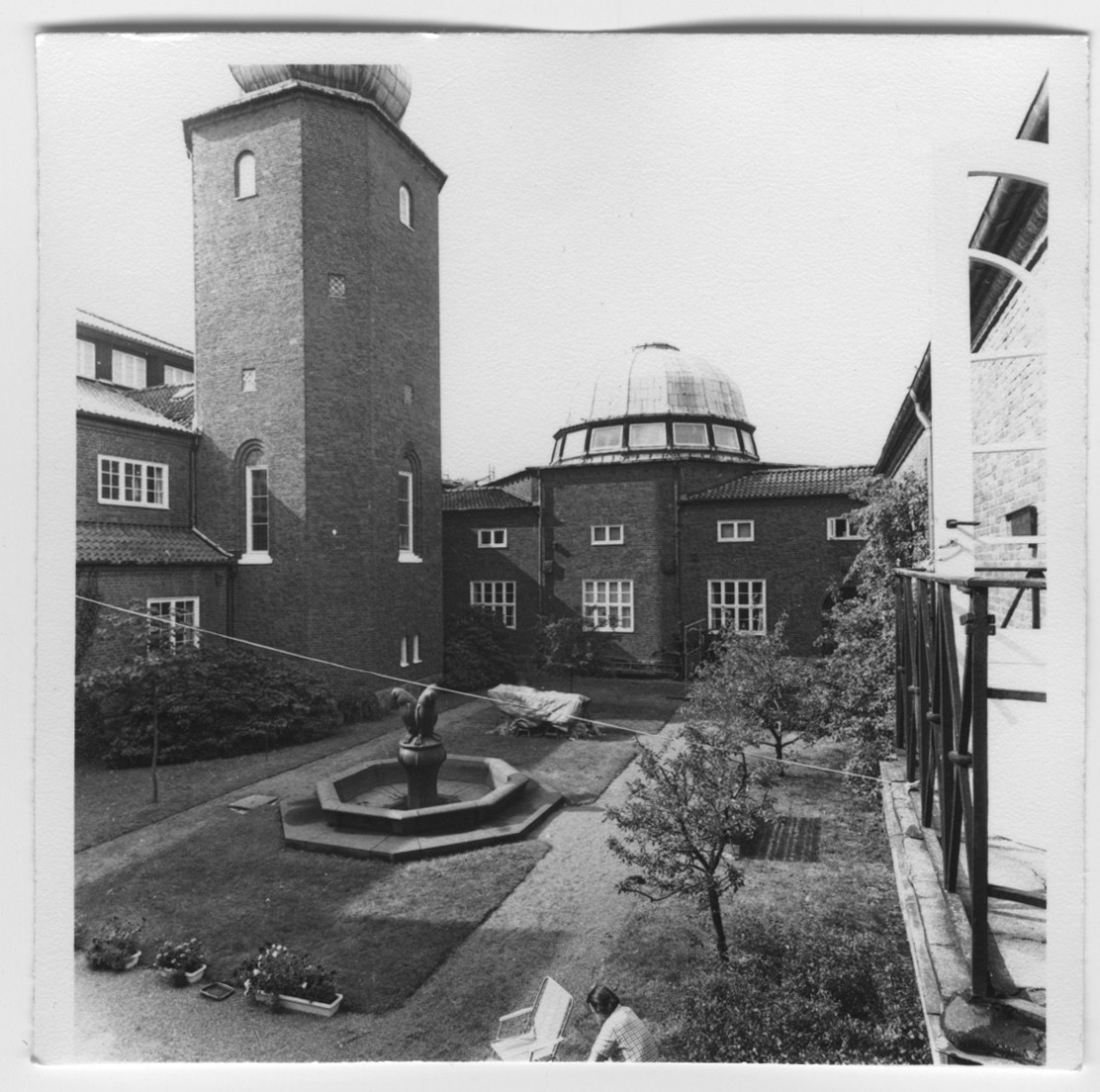 Innergården, Göteborgs Naturhistoriska museum. Vy mot dioramatornet och torn med kupol. I mitten springbrunnen, fontänen, i svart granit med 3 pingviner gjord av Sigrid Friman. Se även fotonr. 6968:4.