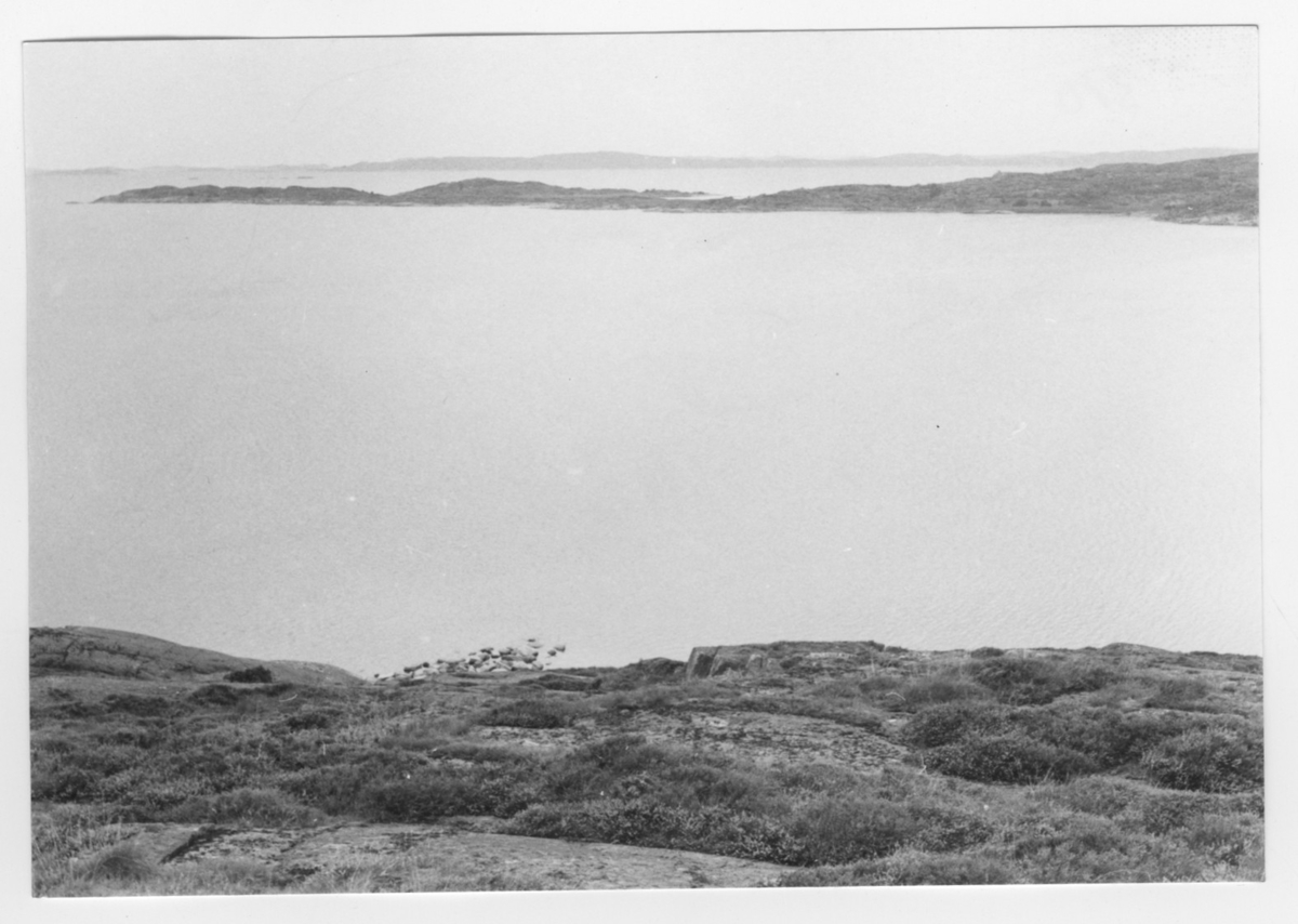 'Bildtext: ''Havsvik. Riktning 320.'' Berghäll i förgrunden, vy ut mot havet med landtunga på avstånd. :: :: Ingår i serie med fotonr. 6970:1-1125, dokumentation av Hisingens naturgeografi, visande landskapsformerna i stora drag och gjord inför exploateringen av området. Platserna för fotograferingen finns utsatta på karta i skala 1:4000 som finns på Göteborgs Naturhistoriska musem. Fotoriktningen mättes med kompass i gammalgrader.'