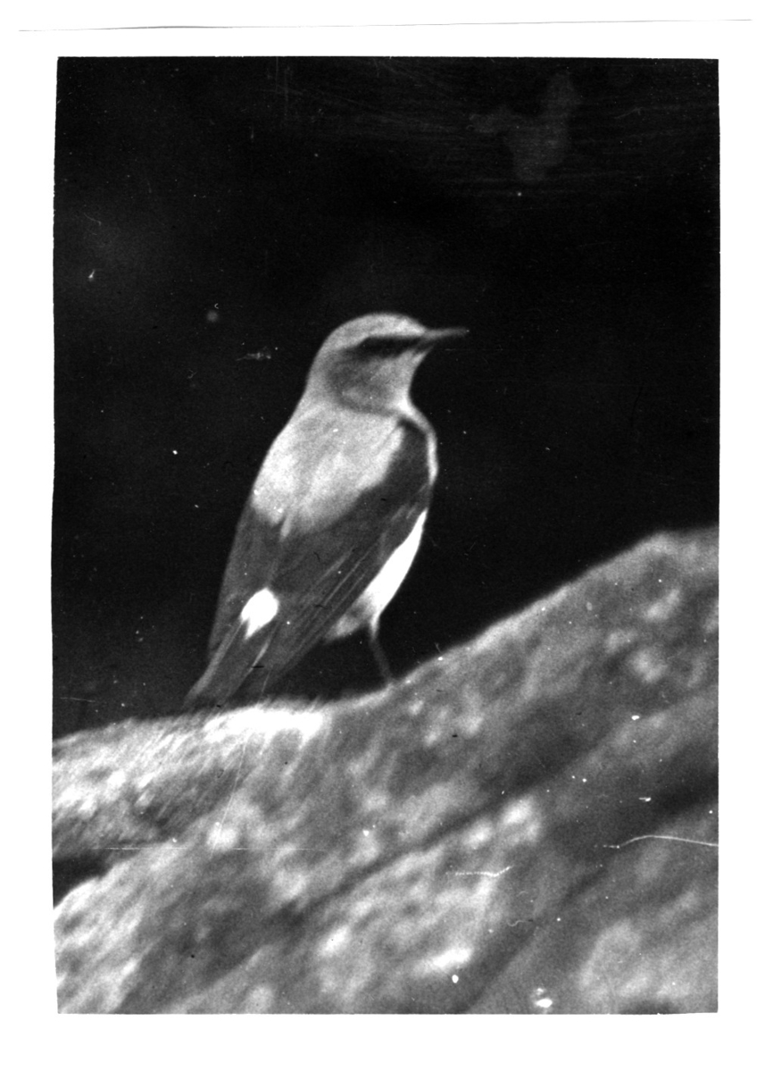 '1 st stenskvätta sedd snett från sidan. :: Text till fotot: ''Denna stenskvätta utgjorde min första fångst som ...jägare.'' :: :: Ingår i fotonr. 6995:1-51, dessa sitter i ett fotoalbum med tillhörande beskrivningar på norska.'