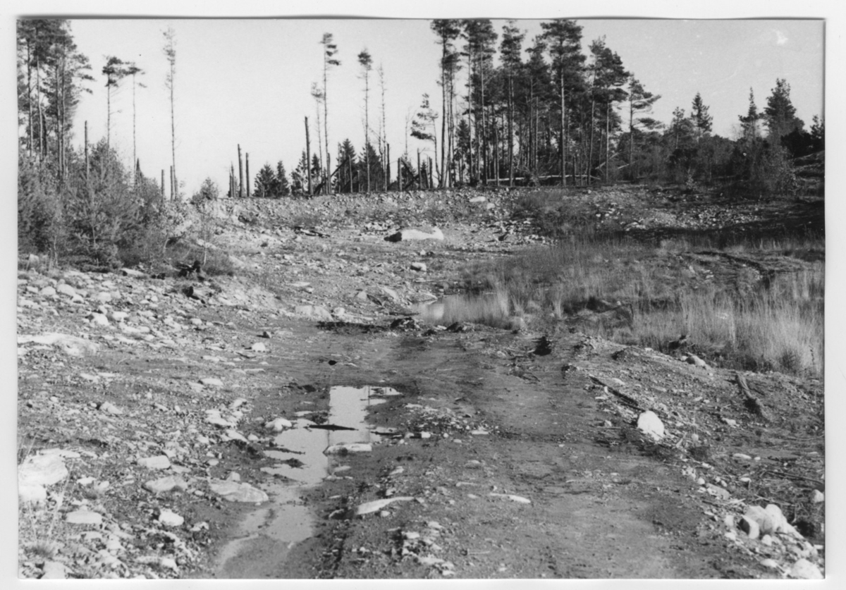 'Bildtext: ''Grustag. Riktning 40.'' :: :: Ingår i serie med fotonr. 6970:1-1125, dokumentation av Hisingens naturgeografi, visande landskapsformerna i stora drag och gjord inför exploateringen av området. Platserna för fotograferingen finns utsatta på karta i skala 1:4000 som finns på Göteborgs Naturhistoriska musem. Fotoriktningen mättes med kompass i gammalgrader.'