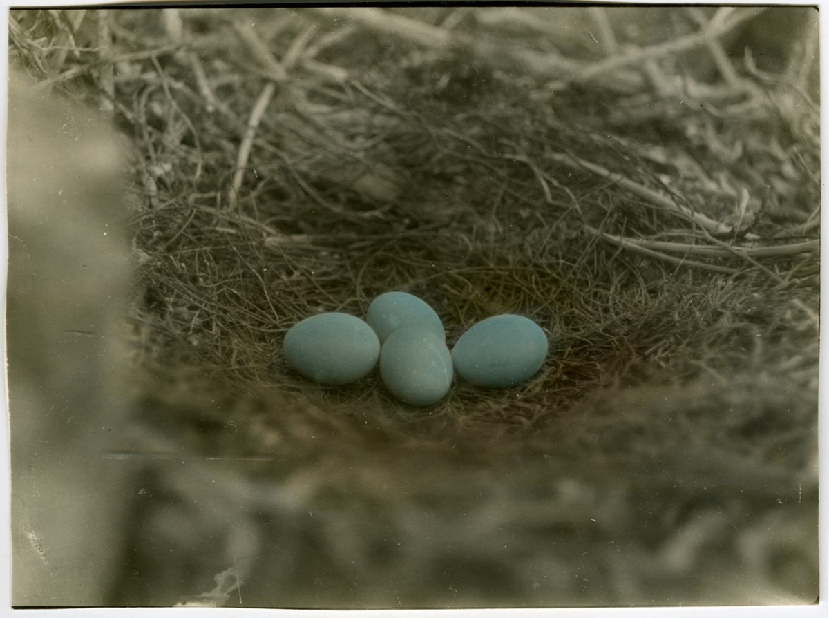'Hägerbo med 4 st ägg. Närbild. :: :: Ingår i fotonr. 6995:1-51, dessa sitter i ett fotoalbum med tillhörande beskrivningar på norska.'