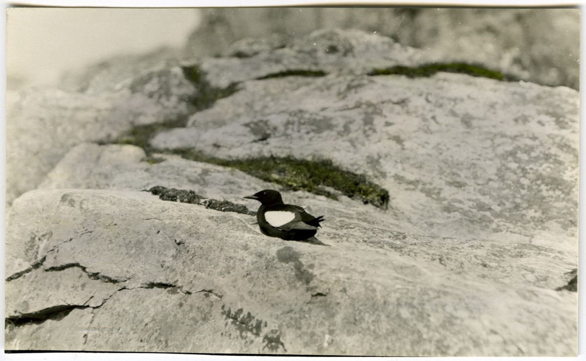 'Närbild på 1 st tobisgrissla liggande på klippa. :: Text till fotot: ''Tejstar vid Kvilholmen fyr.'' :: :: Ingår i fotonr. 6995:1-51, dessa sitter i ett fotoalbum med tillhörande beskrivningar på norska.'