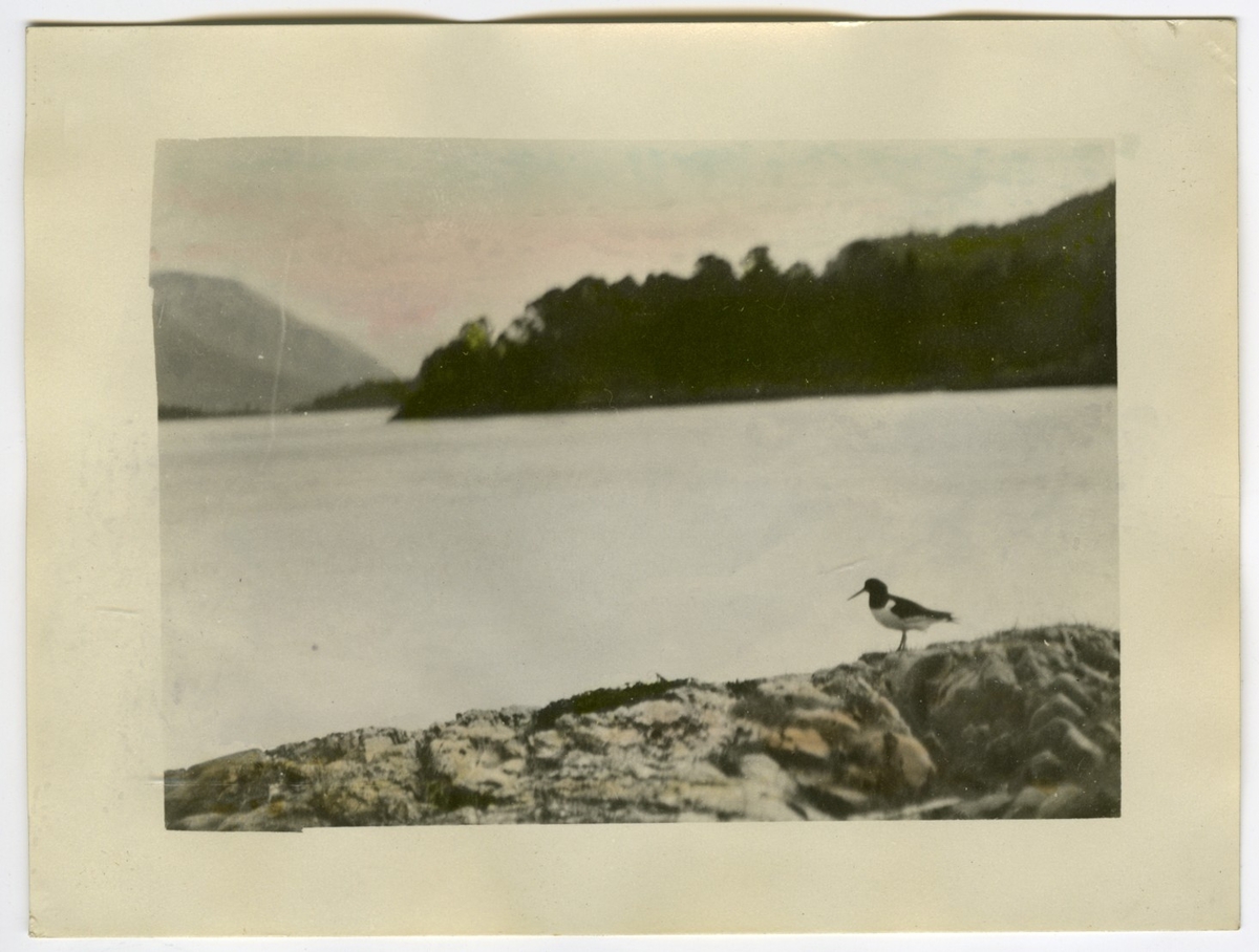 'Vy med 1 st strandskata sitter på berghäll. Vy med hav i bakgrunden. :: Text till fotot: ''Strandskata vid stranden.'' :: :: Ingår i fotonr. 6995:1-51, dessa sitter i ett fotoalbum med tillhörande beskrivningar på norska.'