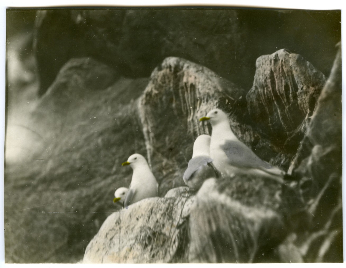 '4 st tretåiga måsar sittande på klippvägg, närbild. :: Text till fotot: ''En grupp tretåiga måsar från kolonin i Sindsoollsindet vid Bjorkäy.'' :: :: Ingår i fotonr. 6995:1-51, dessa sitter i ett fotoalbum med tillhörande beskrivningar på norska.'