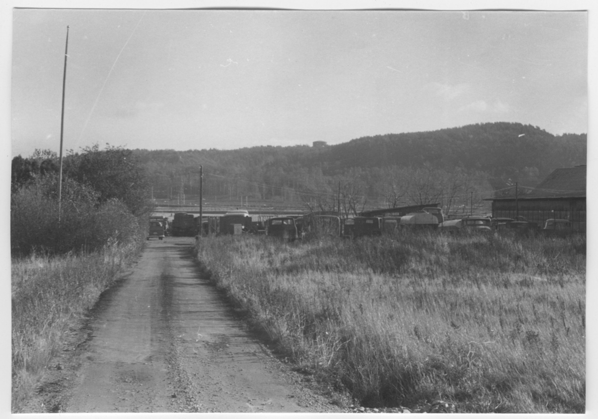 'Bildtext: ''Götaälvdalgång. Riktning 81.'' Vy med öppen mark och grusväg i förgrunden, samling bilar och i bakgrunden trädklätt berg. :: :: Ingår i serie med fotonr. 6970:1-1125, dokumentation av Hisingens naturgeografi, visande landskapsformerna i stora drag och gjord inför exploateringen av området. Platserna för fotograferingen finns utsatta på karta i skala 1:4000 som finns på Göteborgs Naturhistoriska musem. Fotoriktningen mättes med kompass i gammalgrader.'
