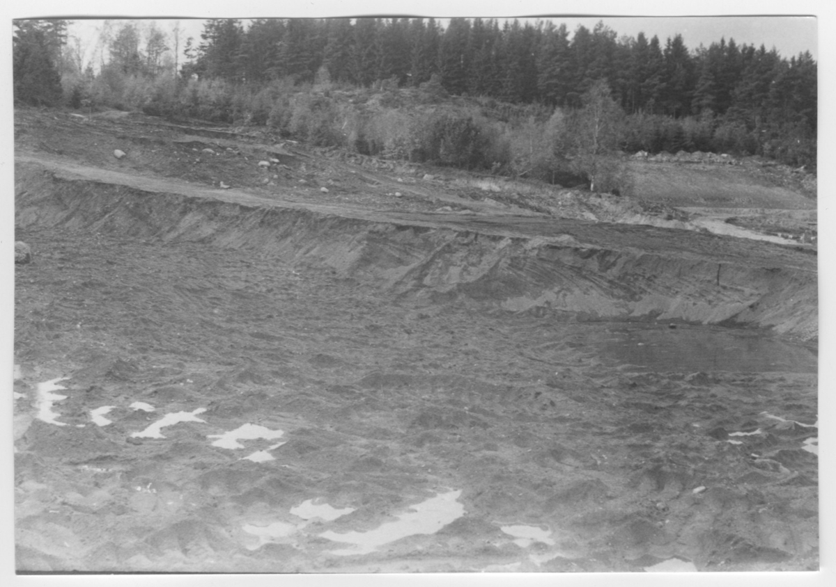 'Bildtext: ''Sandtag med skiktning. Riktning 270.'' :: :: Ingår i serie med fotonr. 6970:1-1125, dokumentation av Hisingens naturgeografi, visande landskapsformerna i stora drag och gjord inför exploateringen av området. Platserna för fotograferingen finns utsatta på karta i skala 1:4000 som finns på Göteborgs Naturhistoriska musem. Fotoriktningen mättes med kompass i gammalgrader.'