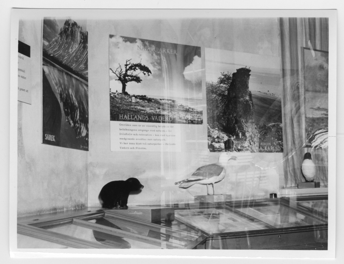 'Vägg med planscher med bilder ''Sarek'' och ''Hallands Väderö'' samt ''Stora Karlsö''. Nedanför trämontrar med glaslock intill vägen och på dem 2 monterade fåglar. :: :: Ingår i serie med fotonr. 6983:1-22.'
