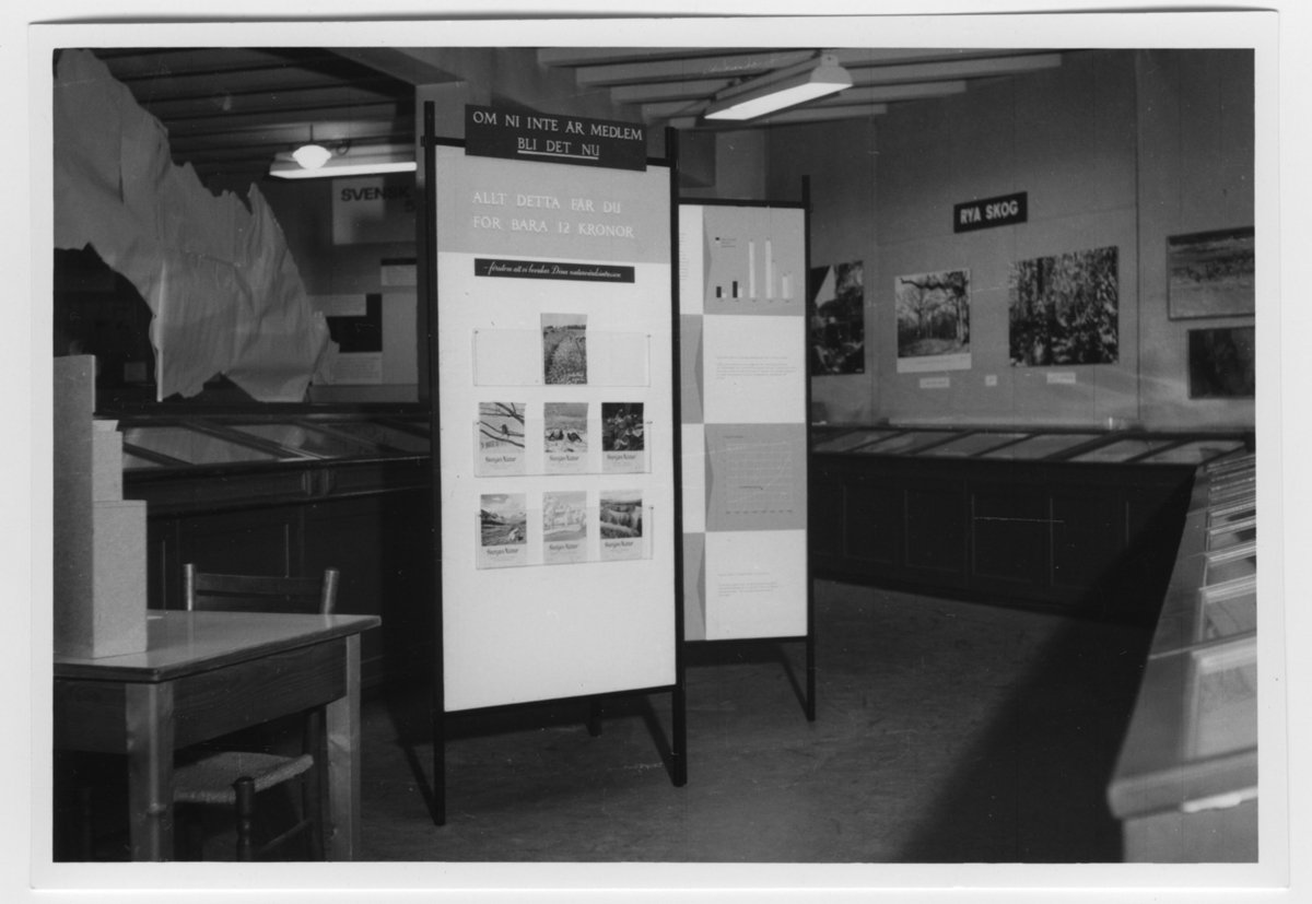 'Utställningsskärm med titel ''Om ni inte redan är medlem -bli det nu!''. På skärmen finns hållare för broschyrer med olika nummer av Sveriges Natur (Svenska Naturskyddsföreningens tidsskrift). :: :: Ingår i serie med fotonr. 6983:1-22.'