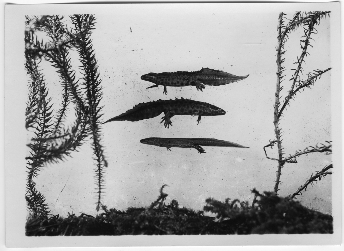 '3 ödlor, 2 hanar och 1 hona, av mindre vattenödlan. :: :: Ingår i serie med fotonr. 7015:1-91 med bilder av reptiler från Otto Cyréns samling.'