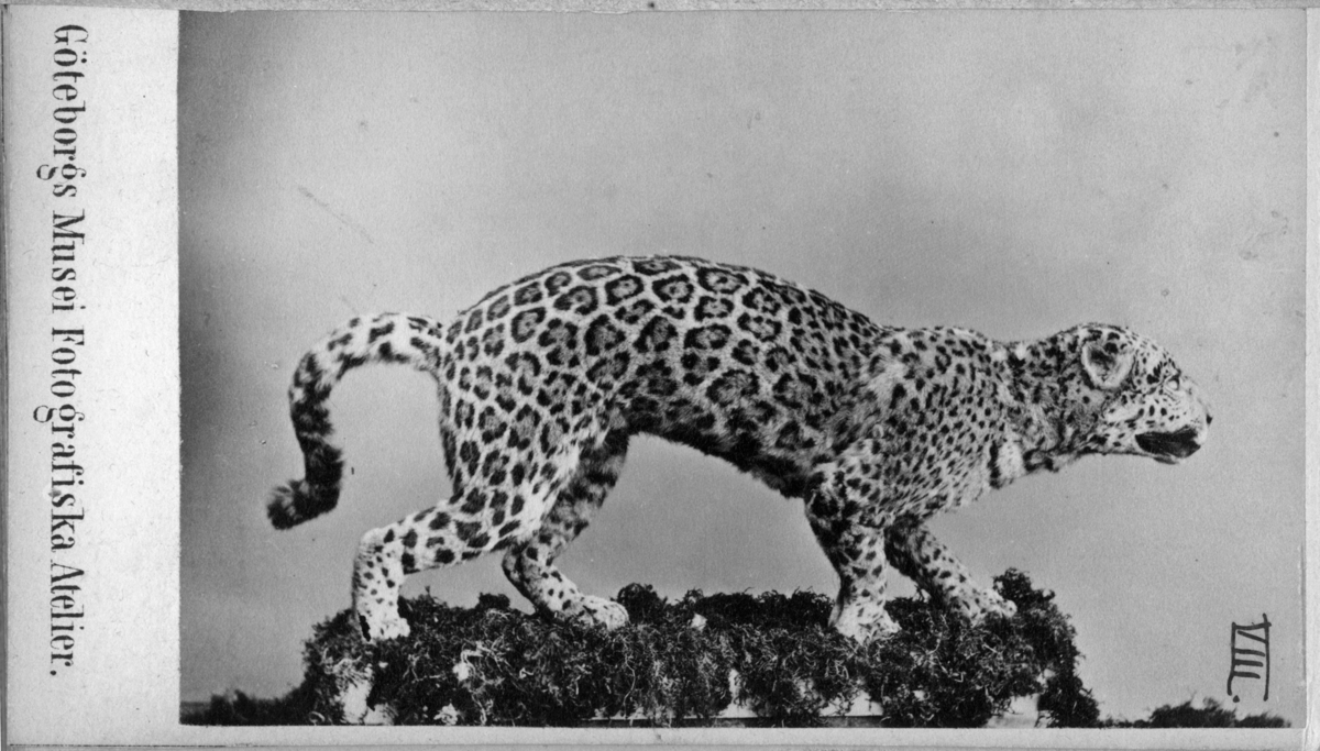 'Monterad jaguar. :: :: Text till bilden: ''Jaguaren. Amerika, som på sin lott ej fått egentliga tigrar, har istället erhållit detta rofdjur, hvilket ock är det största uti nämda verldsdel. I styrka och storlek efterger han föga gamla verldens tiger, hvilken han ock till lefnadssätt liknar. Jaguaren är också lika fruktad i sitt hemland som tigern i Bengalen. I allmänhet uppehåller han sig i skogarnas täta snår och helt nära vattendragen. Till färgen afviker han ifrån andra stora, fläckiga arter af kattslägtet, derigenom att de svarta ringfläckarna merendels omsluta en mindre, punktlig fläck.'' /August Wilhelm Malm år 1866. :: :: Serie med fotonr. 7079:1-37. Fotografierna är monterade i en liten bok, inbunden, med titel ''Fotografier öfer Däggdjur och foglar. Texter av A. W (1866). Malm. Boken återfinns i Göteborgs Naturhistoriska Museums bibliotekssamling under ''Äldretryck''. På baksidan av varje foto finns en text om arten. :: :: Se även fotonr. 5693:1-4.'