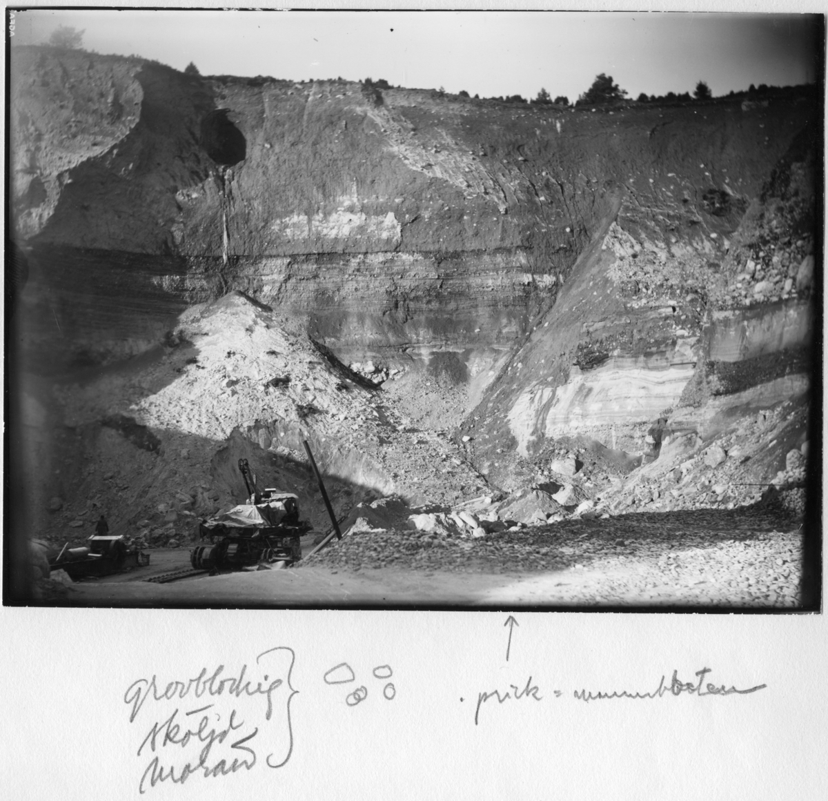 'Bildtext: ''Grovblockig. Sköljd morän. En prick är utsatt för platsen där den subfossila mammutbeten hittades.'' :: :: Beskrivning av mammutbeten: längd 360 mm, diameter 70-80 mm. ''Fyndet har vid bärgningen fallit sönder i 5 större och ett flertal mycket små bitar. :: :: Ingår i serie med fotonr. 7053:1-11. Se även fotonr. 2023-2027 och 2958.'