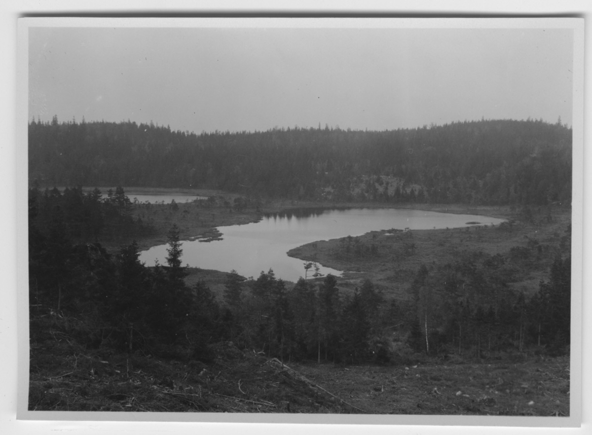 'Smålommens häckningsplats i en tjärn i Hindåstrakten, vy över 2 tjärnar och barrskog. :: :: Se serie med fotonr. 1258-1304.'