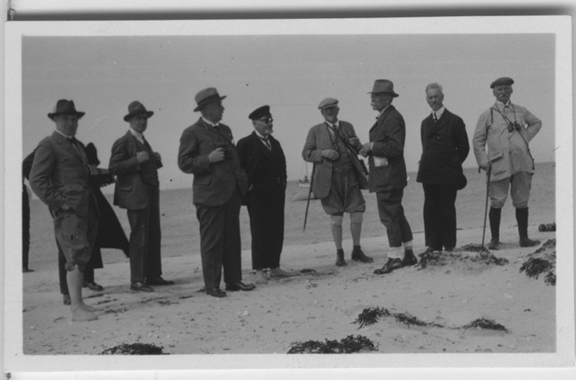 'Göteborgs Biologiska förenings utfärd till Måkläppen och Falsterborev: :: :: Ca 9 män på stranden, fjärde från höger är Leonard Axel Jägerskiöld. I bakgrunden havet och båtar. :: :: Se fotonr. 1384-1395, 1618-1639, 1640-1648 samt 3229 från samma utfärd.'