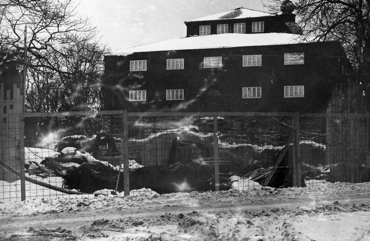 'Tillbyggnaden av Göteborgs Naturhistoriska Museum februari 1979. Göteborgs Naturhistoriska Museum södra ytterväggen med byggarbetsplatsen framför, staket, snö. :: :: Ingår i serie med fotonr. 5527:69-216.'