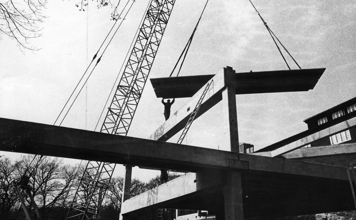 'Tillbyggnaden av Göteborgs Naturhistoriska Museum juni 1979. Lyftkran, byggnadsarbetare, betongbalkar. :: :: Ingår i serie med fotonr. 5527:69-216.'