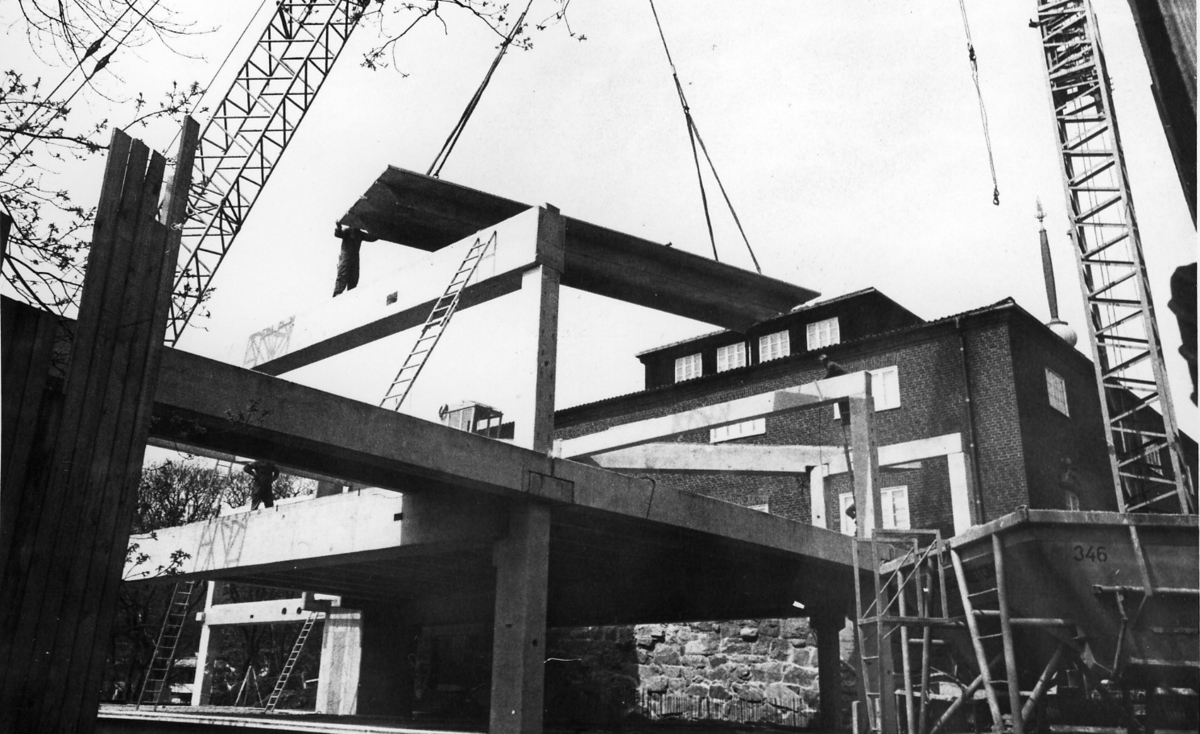 'Tillbyggnaden av Göteborgs Naturhistoriska Museum juni 1979. Göteborgs Naturhistoriska Museum södra sidan, betongbalkar uppsatta. Lyftkran, byggnadsarbetare. :: :: Ingår i serie med fotonr. 5527:69-216.'