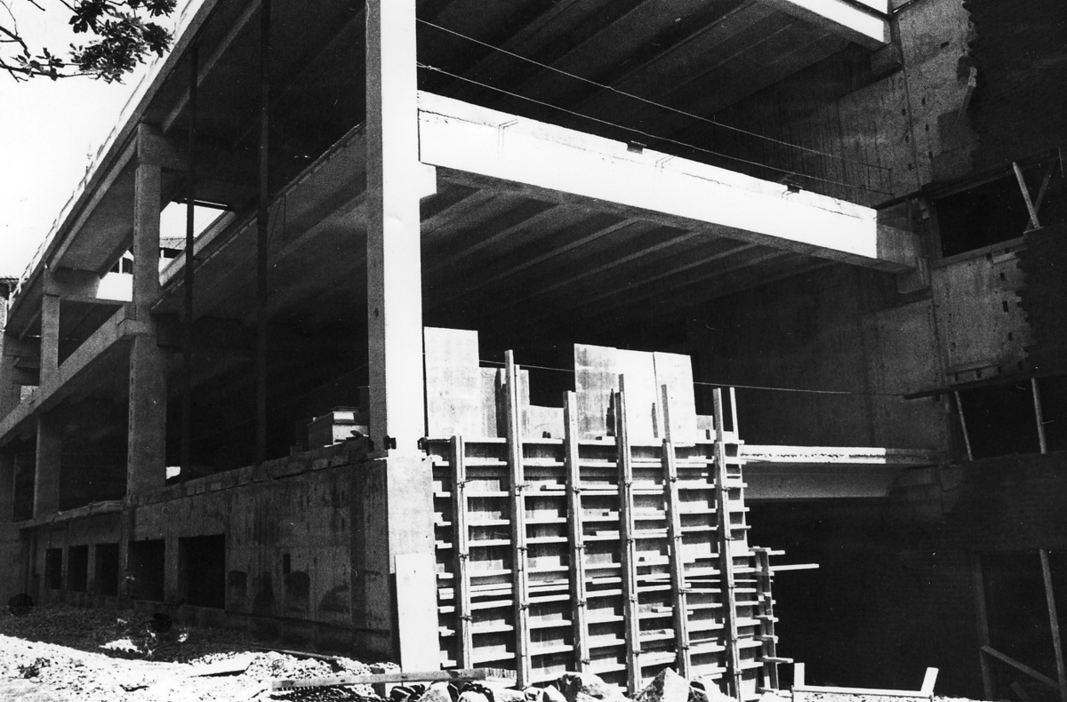 'Tillbyggnaden av Göteborgs Naturhistoriska Museum juni 1979. Västra ytterväggen av Göteborgs Naturhistoriska Museum gamla byggnaden och tillbyggnaden. :: :: Ingår i serie med fotonr. 5527:69-216.'