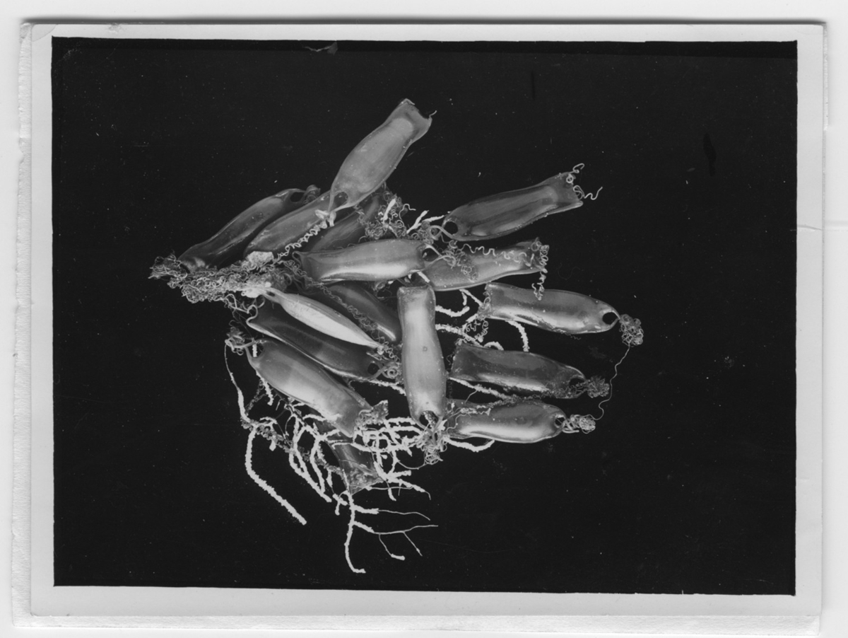 'Klunga ägg av haj/rocka. Äggens längd ca 60 mm. :: :: Ingår i serie med fotonr. 5590:1-15.'