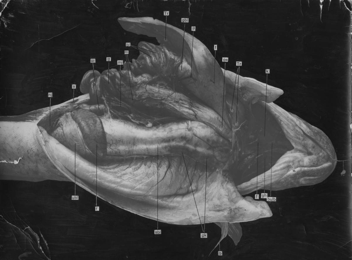 'Fiskhuvud sett från undersidan, öppnat. :: :: Ingår i serie med fotonr. 5590:1-15.'