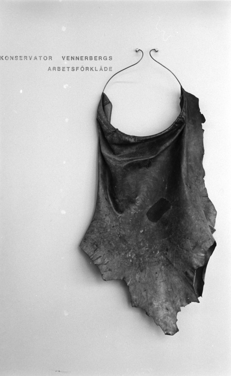 'Foto på Jubileumsutställningen, Göteborgs Naturhistoriska museum 150 år. :: :: Närbild på konservator Wennerbergs arbetsförkläde.'