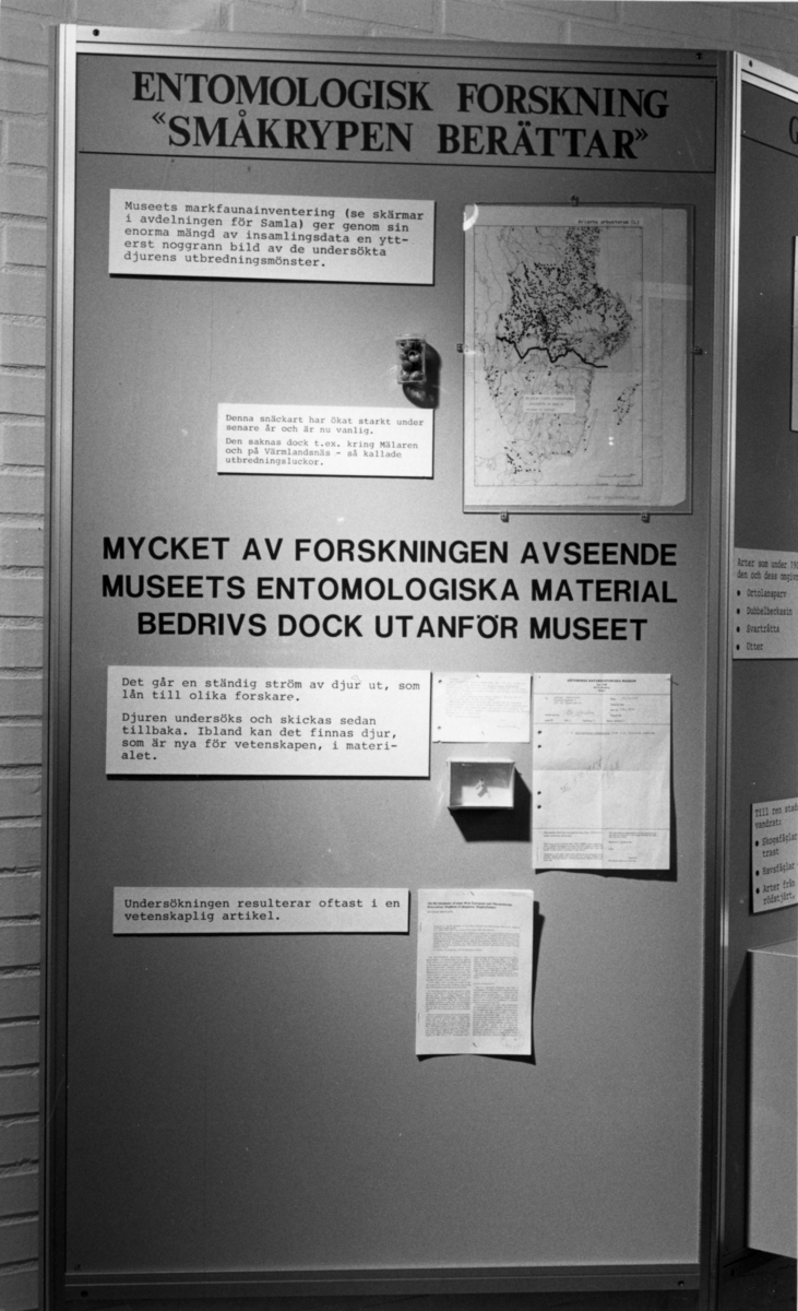 'Foto på Jubileumsutställningen, Göteborgs Naturhistoriska museum 150 år. :: :: Utställningsskärm angående entomologisk forskning. Med muséets markfaunainventering som exempel samt hur dess material även forskas på utanför muséet. Snäcka (Arianta arbustorum) och insekt (heterothops binotatus (Coleoptera)) som exempel.'