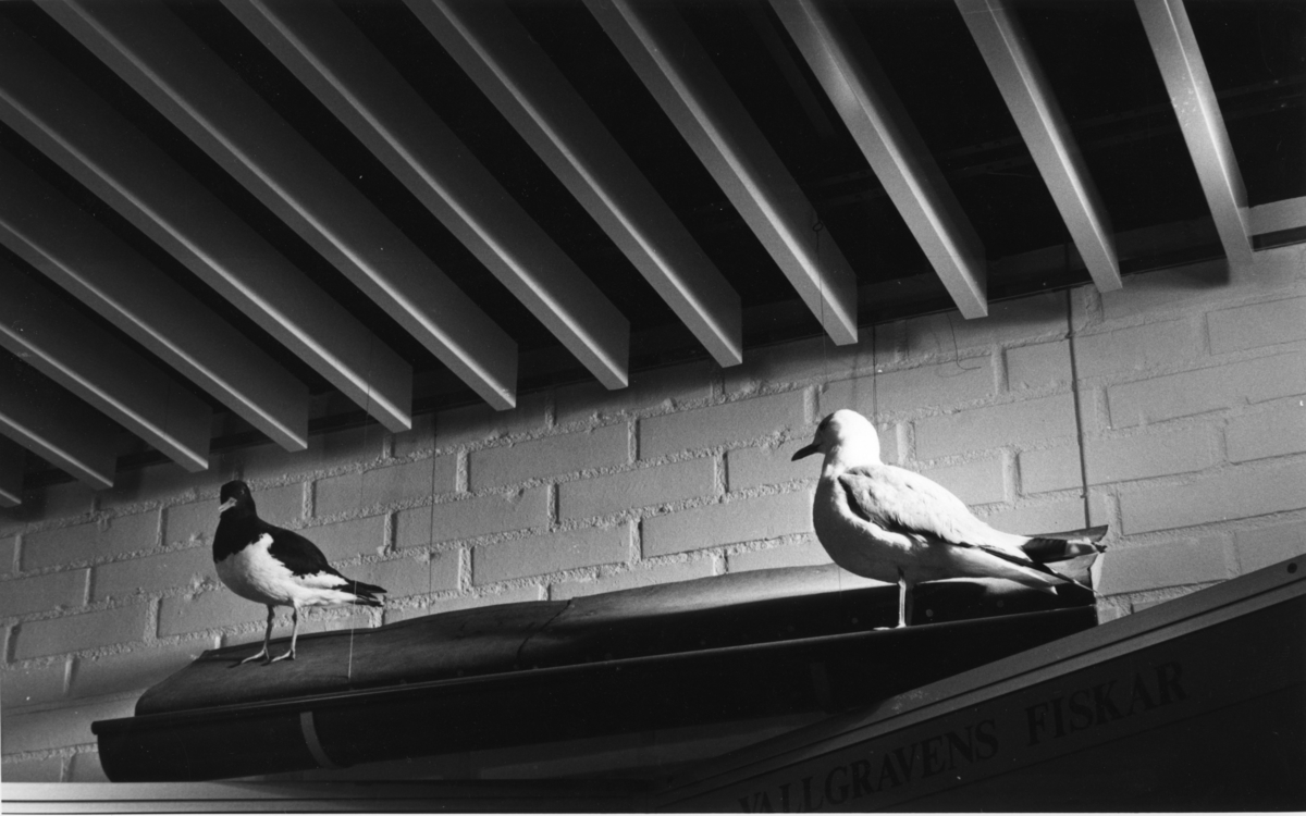'Foto på Jubileumsutställningen, Göteborgs Naturhistoriska museum 150 år. :: :: Detalj från utställningen. Från avdelningen kallad djurliv i Göteborg, 2 fåglar på ett ''tak'', under fåglarna skylten: ''Vallgravens Fiskar''.'