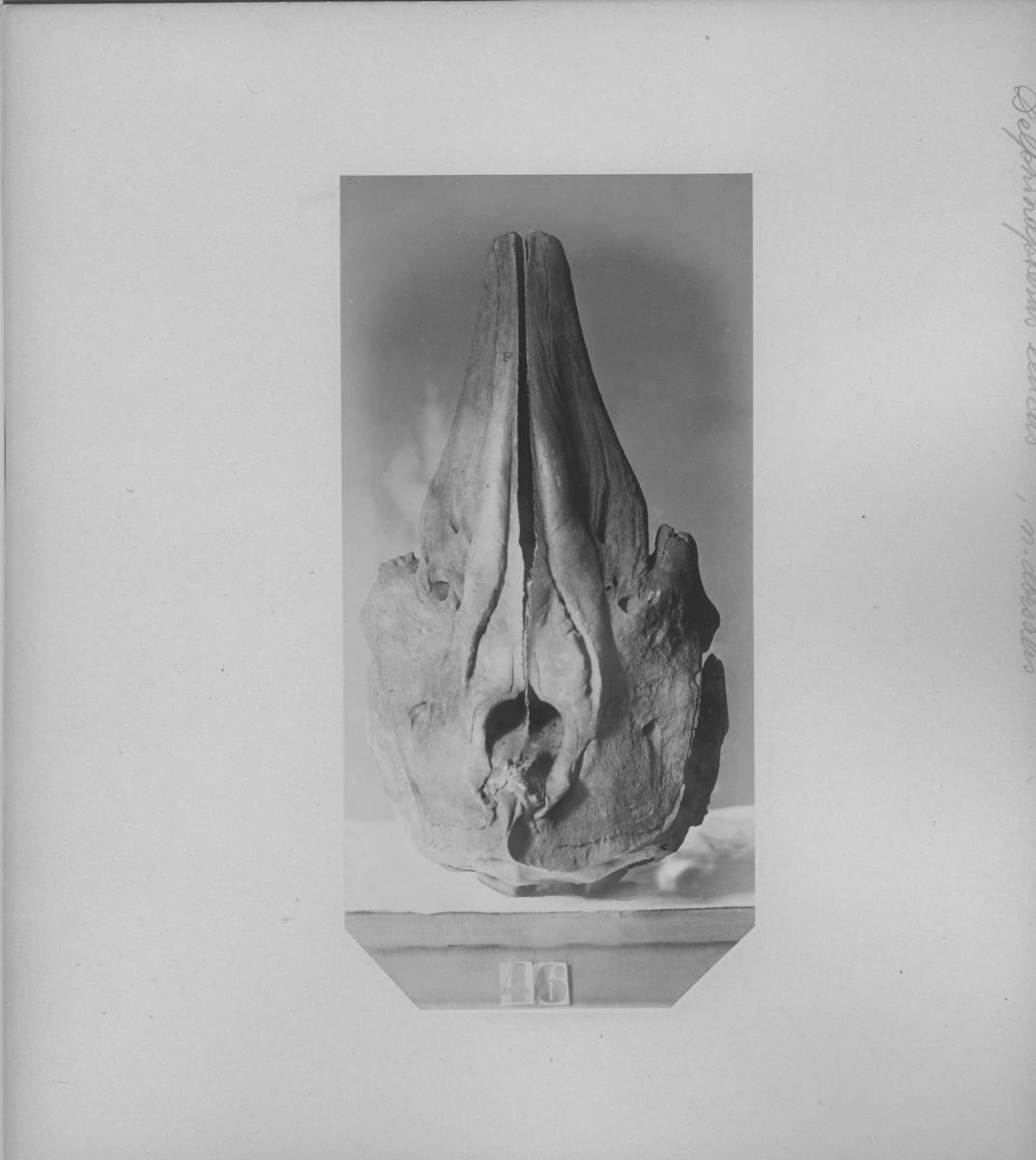 'Bilder på kotor och skelettdelar på podier.''Fotografier till hvaldjur m.m. från Vega-samlingen''. :: :: Enligt anteckning på framsidan av fotografiet: ''Delphinapterus leucas, n dorsalis''.'