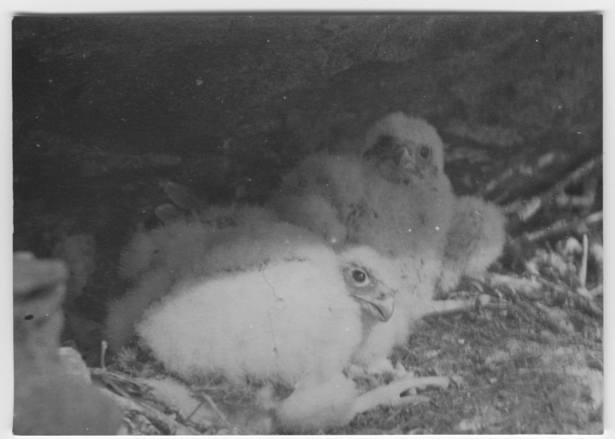 'Närbild på 3 fjälluggleungar i bo. :: :: Ingår i serie med fotonr. 5633:1-4.'