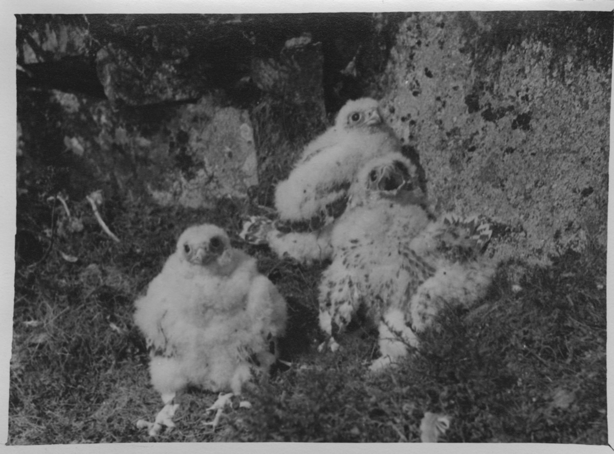 'Närbild på 3 fjälluggleungar i bo. :: :: Ingår i serie med fotonr. 5633:1-4.'
