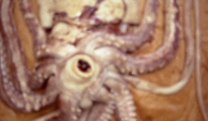 'Bläckfisk i närbild och från kaj. :: :: Suddig närbild på öppning, näbb.'