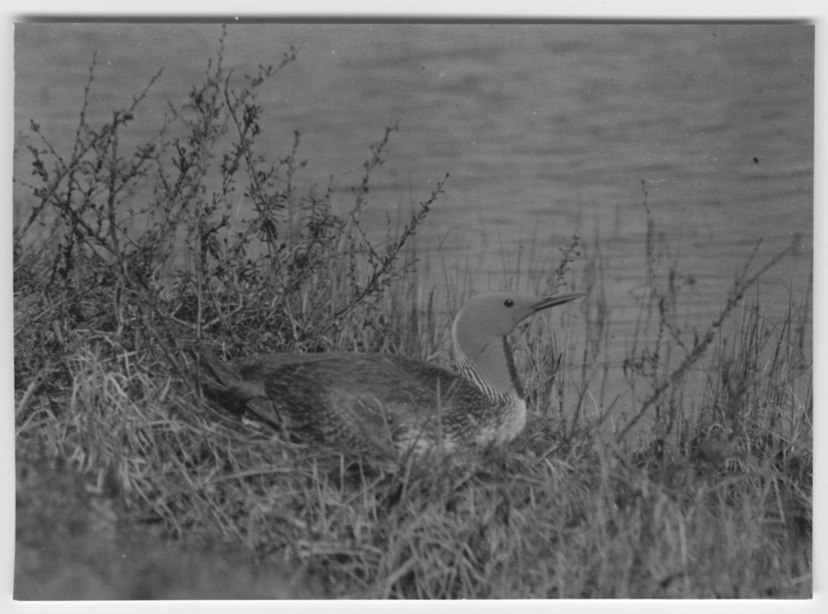 'Illustration till '' Naturens liv i ord och bild'': :: Lom på boet, vy med vatten i fonden. :: :: Ingår i serie med fotonr. 5638:1-5.'