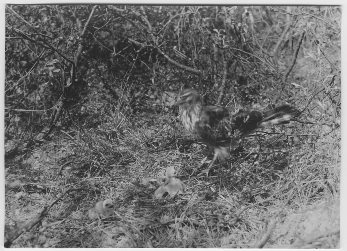 'Illustration till '' Naturens liv i ord och bild'': :: 1 fågel vid bo? Med 3 ungar. :: :: Ingår i serie med fotonr. 5638:1-5.'