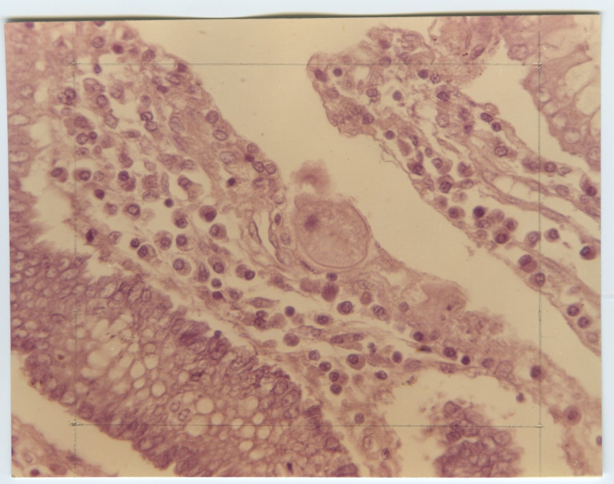 'Mikroskopbilder på amöba: :: Text på baksidan av fotot: ''Balantidium coli invading the mucosa ofanintestinal villus x 500. 9505-/1.65'' :: :: Ingår i serie med fotonr. 5653:1-16.'