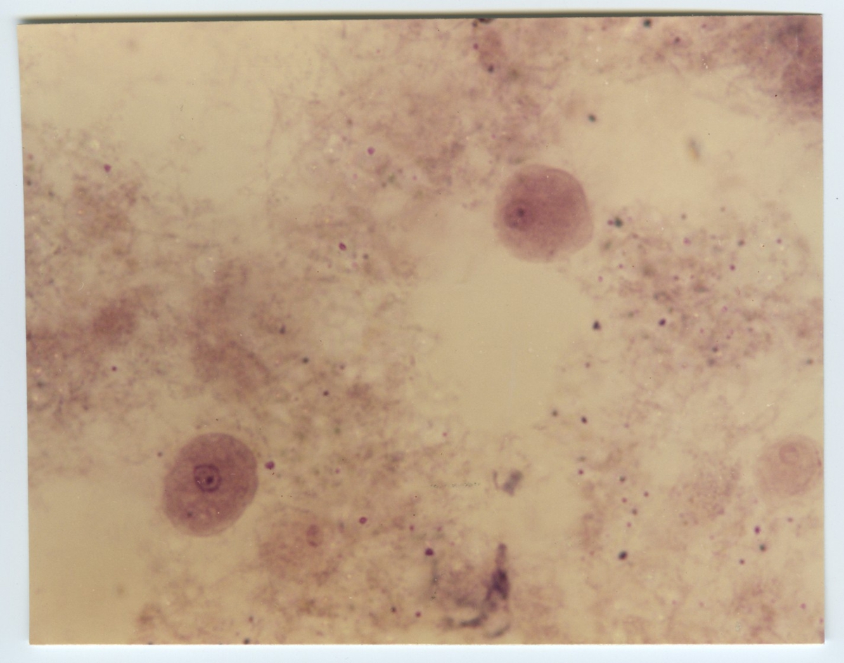 'Mikroskopbilder på amöba: :: Text på baksidan av fotot: ''Two Entamoeba coli trophozoites x 800. 90-10 1.65'' :: :: Ingår i serie med fotonr. 5653:1-16.'