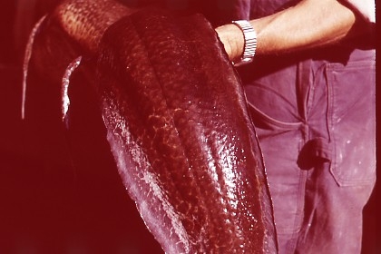 'Bilder en död lungfisk från akvariet. Avgjuten och placerad i basutställningen på Göteborgs Naturhistoriska museum, 1960. Avgjutningen gjord av Björn Wennerberg. :: :: En person håller i fisken, ryggsidan av fisken fotograferad.'