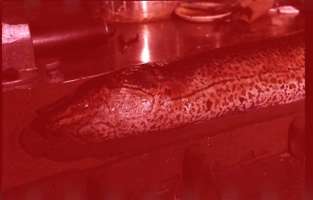 'Bilder en död lungfisk från akvariet. Avgjuten och placerad i basutställningen på Göteborgs Naturhistoriska museum, 1960. Avgjutningen gjord av Björn Wennerberg. :: :: Fisken liggande bland redskap på en bänk. Närbild på överkroppen.'