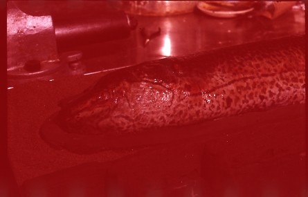 'Bilder en död lungfisk från akvariet. Avgjuten och placerad i basutställningen på Göteborgs Naturhistoriska museum, 1960. Avgjutningen gjord av Björn Wennerberg. :: :: Fisken liggande bland redskap på en bänk. Närbild på huvudet.'