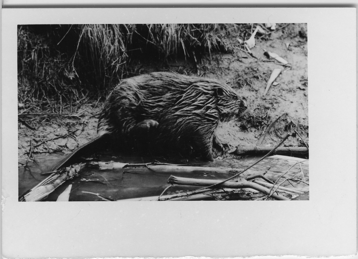 'Närbilder på bävrar som fäller träd. :: :: Närbild på en bäver på stranden till ett vattendrag. :: :: Ingår i serie med fotonr. 5670:1-27.'