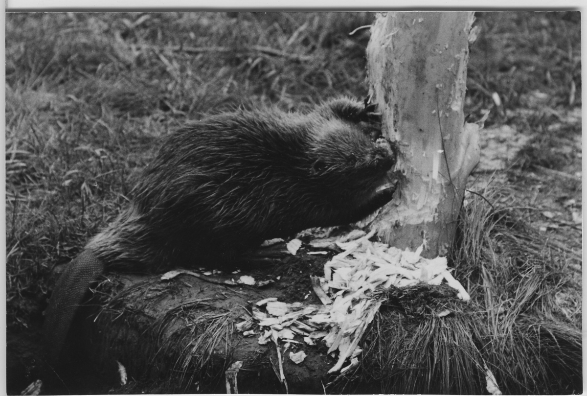 Titel: 'Närbilder på bävrar som fäller träd. :: :: En bäver gnagandes på en trädstam. :: :: Ingår i serie med fotonr. 5670:1-27.'