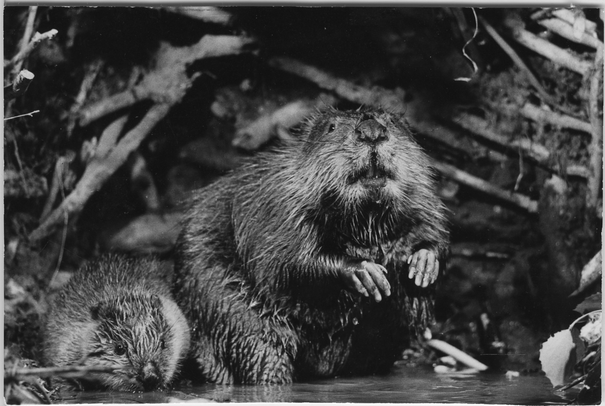 'Närbilder på bävrar som fäller träd. :: :: En bäverhona samt unge invid vatten med rötter bakom dem. :: :: Ingår i serie med fotonr. 5670:1-27.'