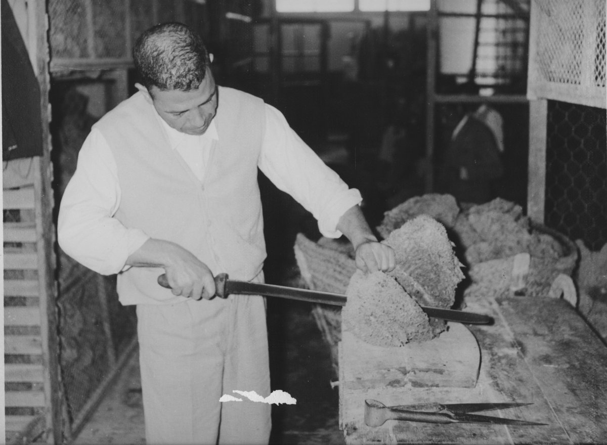'1 man bearbetar tvättsvamp med långt knivverktyg. ''Tillskärning av större tvättsvampar för försäljning.'' På baksidan står ''N 16. - Coupe des éponges de grandes tailles pour la commercialisation.'' :: :: Ingår i serie 5671:1-12 varav vissa bilder finns i basutställningen.'