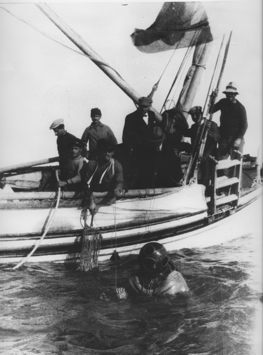 '8 män i en båt. En person med dykdräkt i vattnet, i färd med att ta upp tvättsvamp? ''Dykare vid fiskebåtarna på väg upp ur vattnet med sin fångst.'' På baksidan står ''N 28. Scaphandrier au travail sur les lieux de pêche remontant de la mer avec le produit de sa peche.'' :: Ingår i serie 5671:1-12 varav vissa bilder finns i basutställningen.'