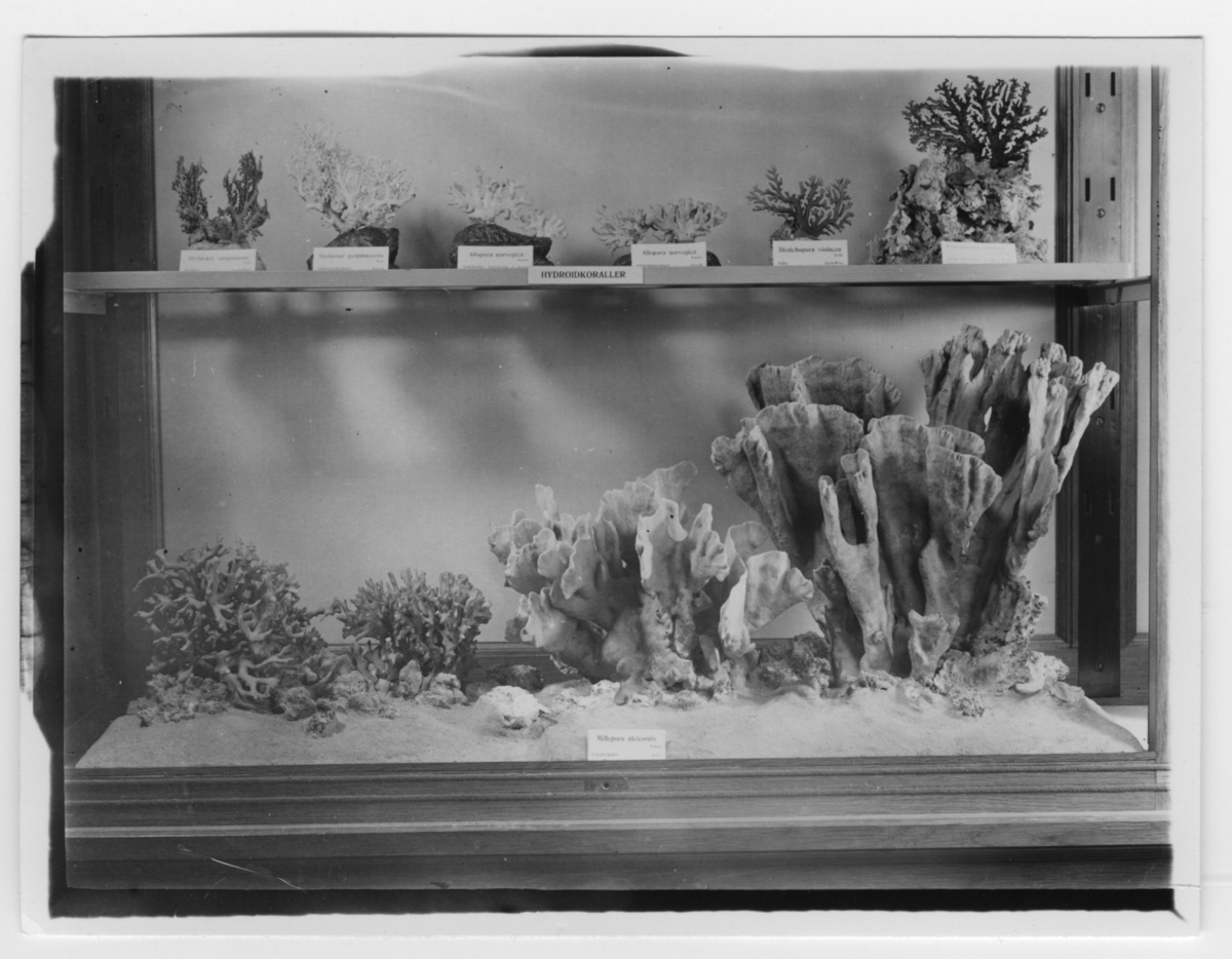'Hyllor i glasmonter med koraller. :: :: Ingår i serie med fototnr. 5680:1-23.'