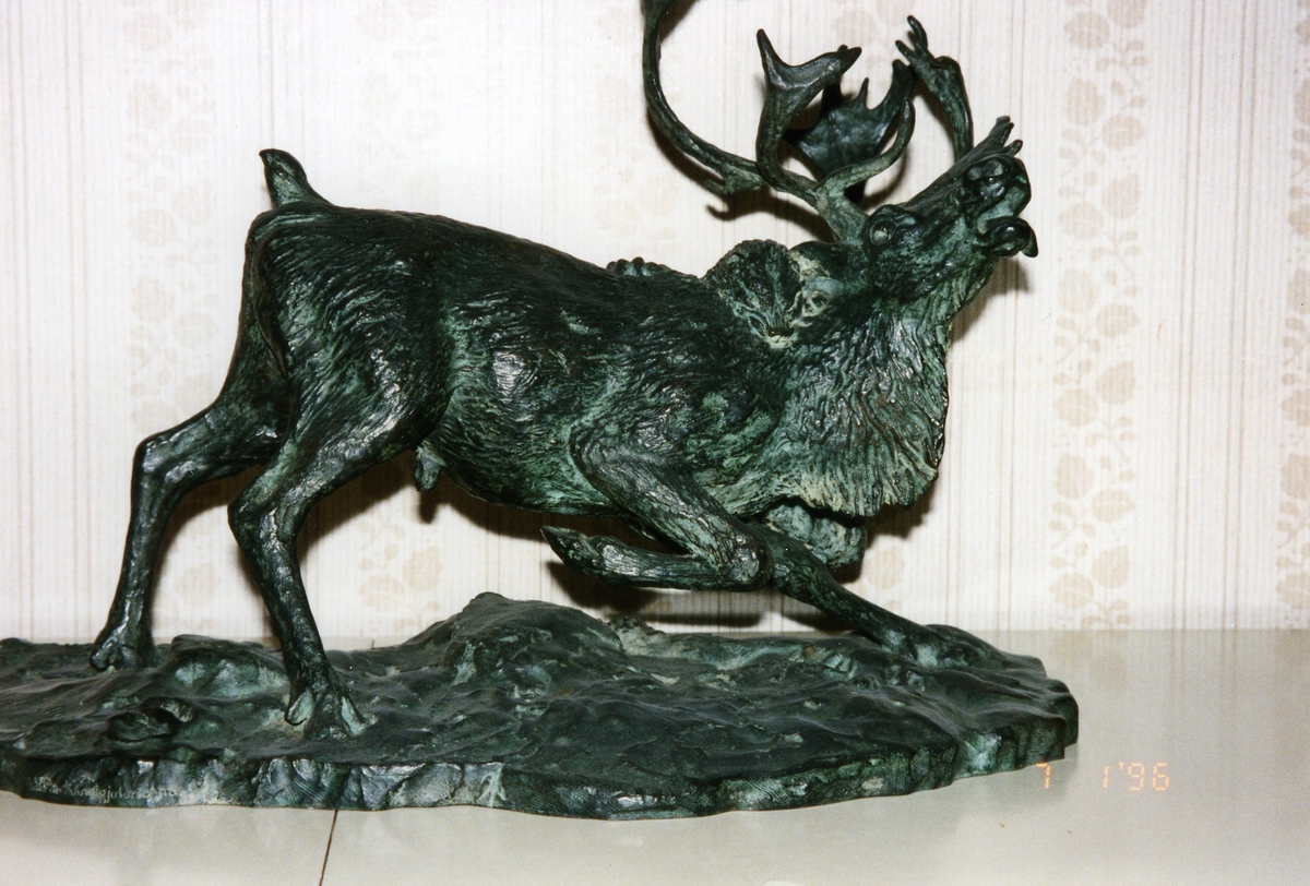 'Bilder på en bronsskulptur ''Ren'' av Olof Gylling, ca 42x30 cm. :: :: Fotograferad från sidan.'