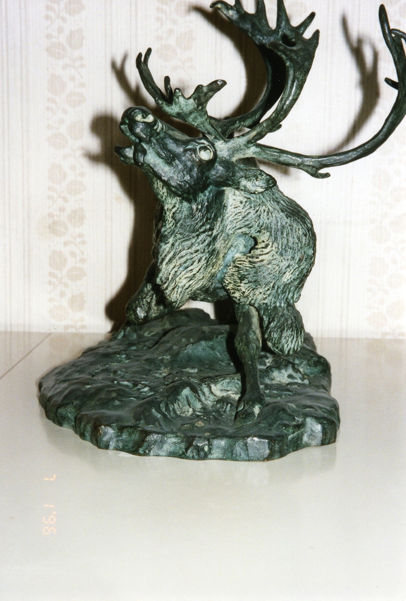 'Bilder på en bronsskulptur ''Ren'' av Olof Gylling, ca 42x30 cm. :: :: Fotograferad framifrån.'